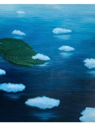 Three other pieces are conceived from the circular format and in smaller dimensions, directing everything towards a central point, an emphatic gesture towards a single element. This series is called Prognosis, three scenes with different atmospheres. In one of them the ground is arid, the cracked earth does not show any sign of life, above it floats a fragment from which a dry tree can be glimpsed. There is heat and smoke and also a certain nostalgia. In another, there is a large space for the blue: sky and sea, the once contained water has expanded and encompasses everything, small pieces of ice are carried away by the tide and in the center, like a castaway, a tree or a small, glowing forest. In the last piece of this set it is dark night and the wet grass is smelled, another group of trees from which the plume of a palm tree peeps out and again the cloud, barely sketched, above them; it is inevitable to perceive a small wink towards the artist’s land. Symbols of loneliness, desolation, a certain sense of isolation, three stories about the same subject. The absence of the human being stands out in his production, each component of the landscape is a body that feels and communicates.
